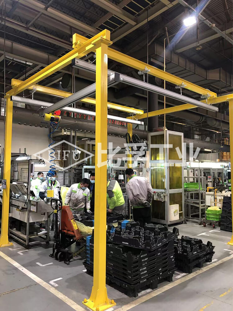 氣動同軸控制款氣動平衡吊配專用氣動夾具配鋼結(jié)構(gòu)鋁合金軌道應(yīng)用案例。